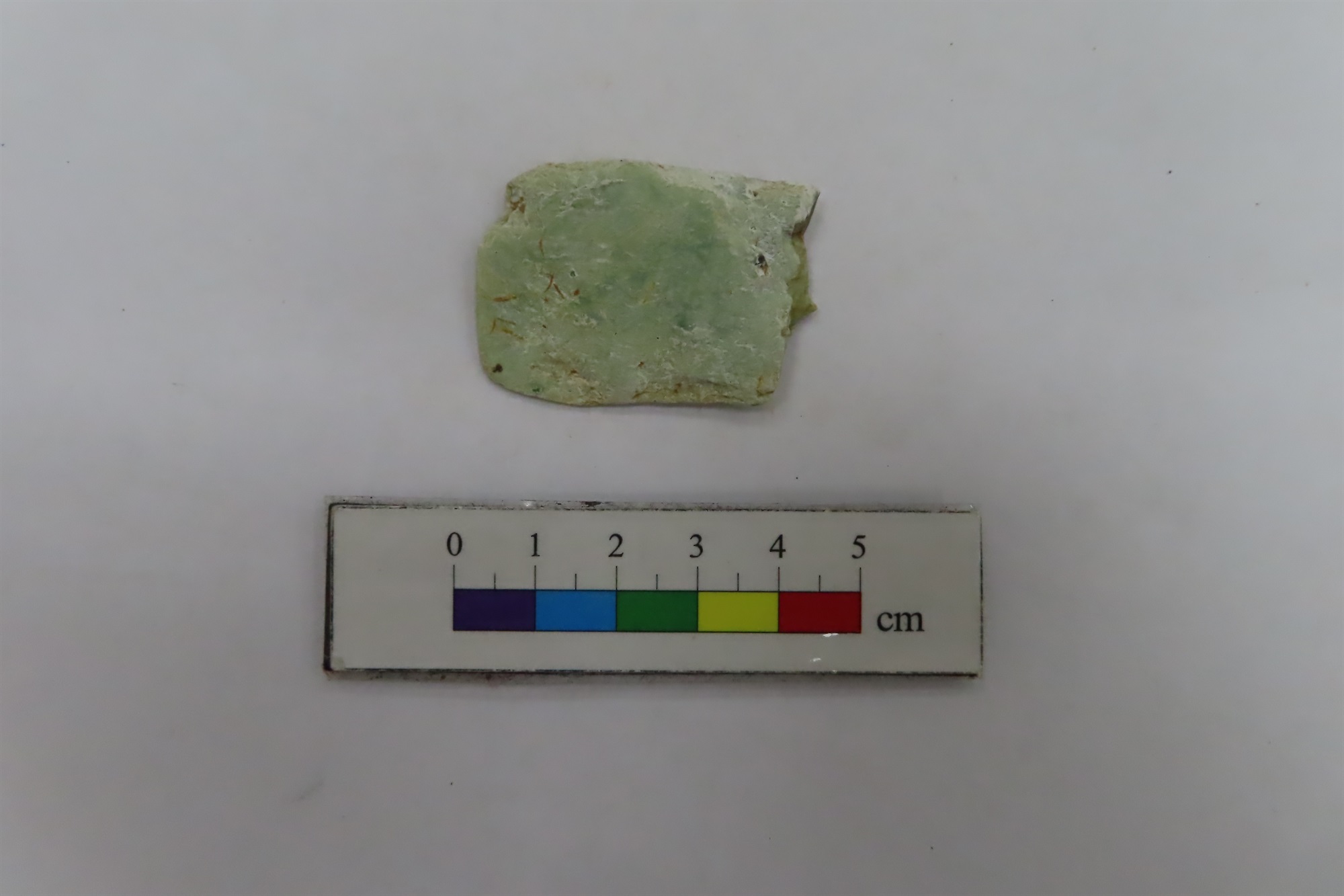 分析概述 本件樣本為採集自水蛙窟遺址的玉器,整體殘缺,器形不明。以手持式XRF(HITACHI X-MET8000)檢測,其中比例最高者依序為矽(Si)24.982%、鎂(Mg)14.9698%、鈣(Ca)6.7531、鐵(Fe)2.6991%等,另外亦檢測出鋁(Al)、磷(P)、錳(Mn)、鎳(Ni)、鋅(Zn)等化學元素。