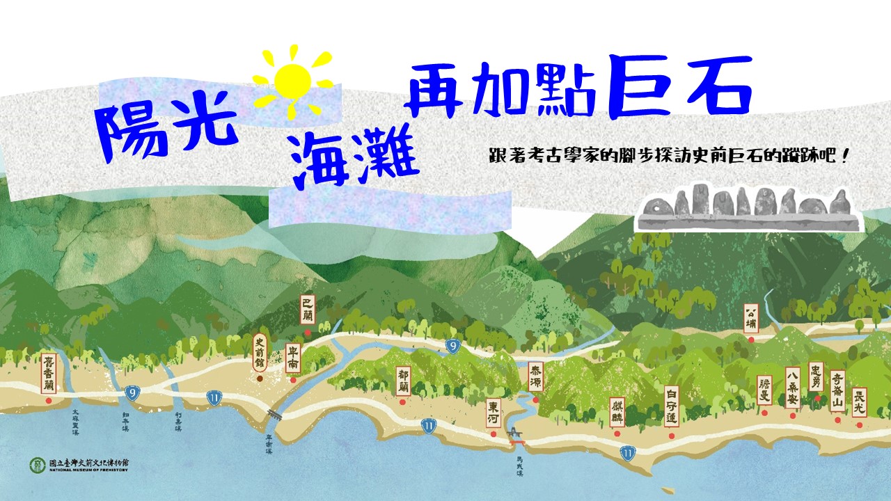 在臺灣東部在臺灣東部的花蓮及臺東境內,分布著各式型態的巨石遺存,這些神秘而碩大的人造遺留,靜靜錯落於山林田野之中,包含著單石、石輪、石柱、岩棺等類型。讓我們跟隨著考古學家的腳步,探訪史前碩大神秘的巨石吧!的花蓮及臺東境內,分布著各式型態的巨石遺存,這些神秘而碩大的人造遺留,靜靜錯落於山林田野之中,包含著單石、石輪、石柱、岩棺等類型。讓我們跟隨著考古學家的腳步,探訪史前碩大神秘的巨石吧!